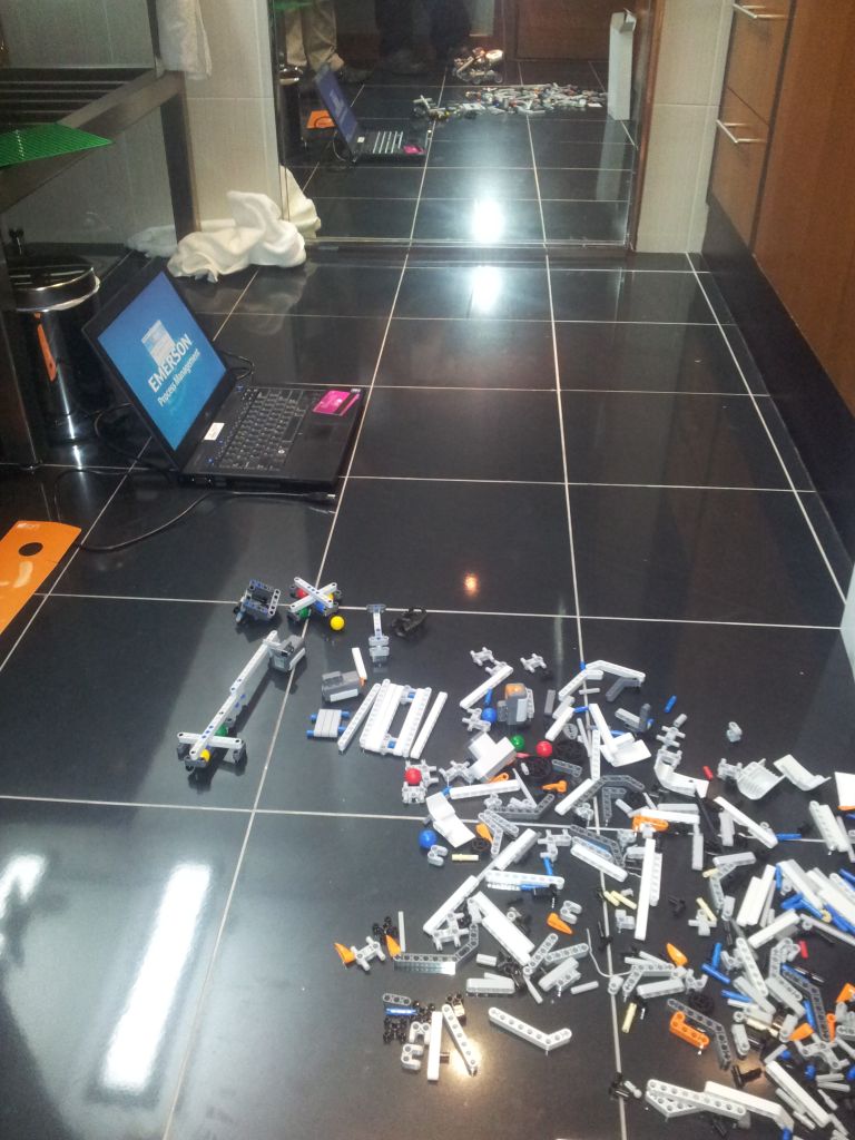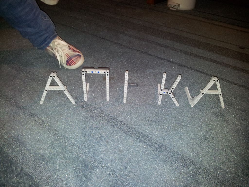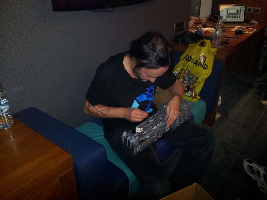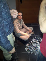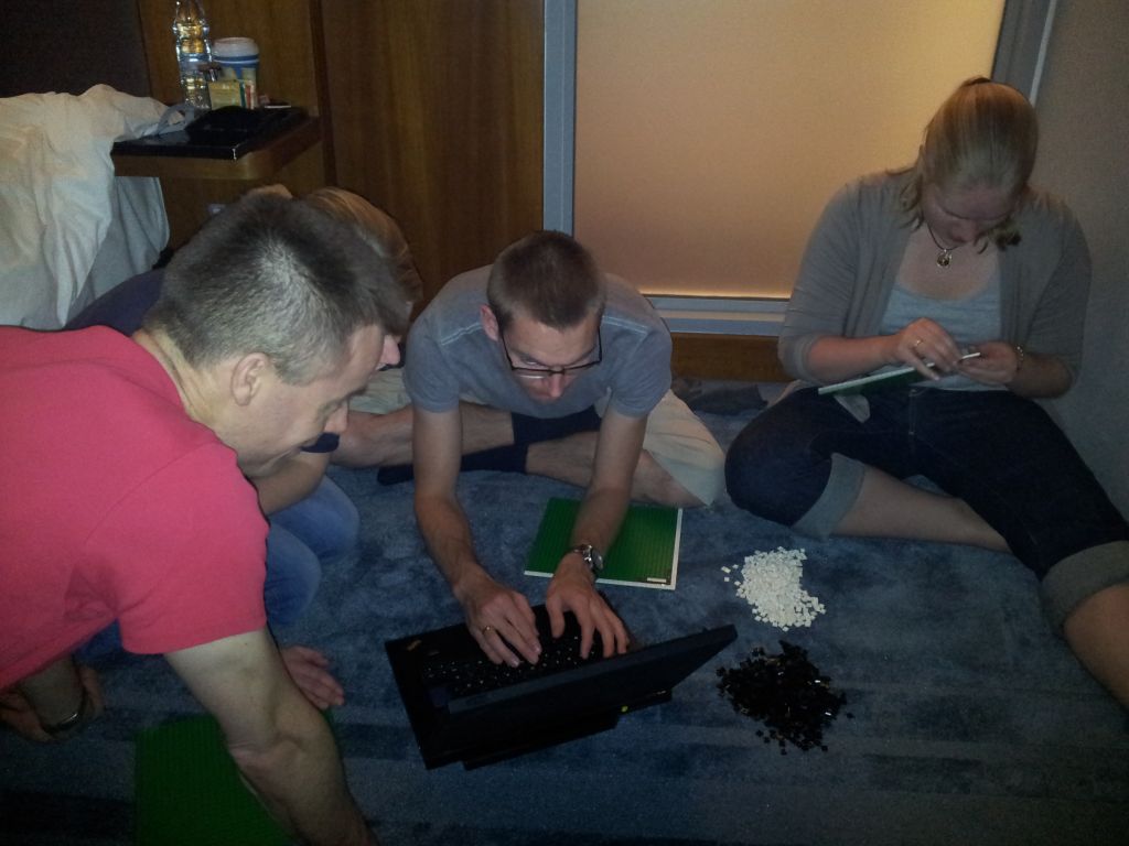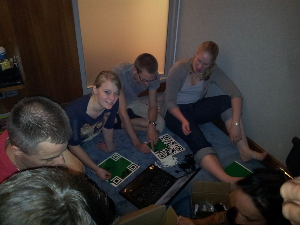 | QR building event at Baz's: Jenn brought base plates und tons of black and white 1x1 tiles ... so we started building QR codes. Baz invited us ... and was absent in the beginning ... so we started building on the carpet in front of Baz's room! |